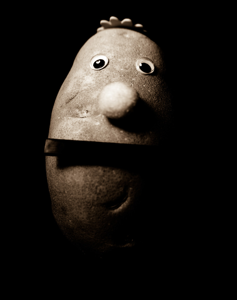 I read about the photo "Potato #345" by Kevin Abosch which sold for a million Euros. So, I was thinking, I'll take a photo of a potato with a large format digital camera and give it away for free. My potato didn't look as interesting as Abosch's, so I asked my daughter to embellish it. What resulted I titled "The Most Interesting Potato in the World". Using the amazing Kodak Aero Ektar 7 Inch, it was able to cover the 9x11 inch sensor with a macro style shot. Then toned to Sepia in LightRoom.