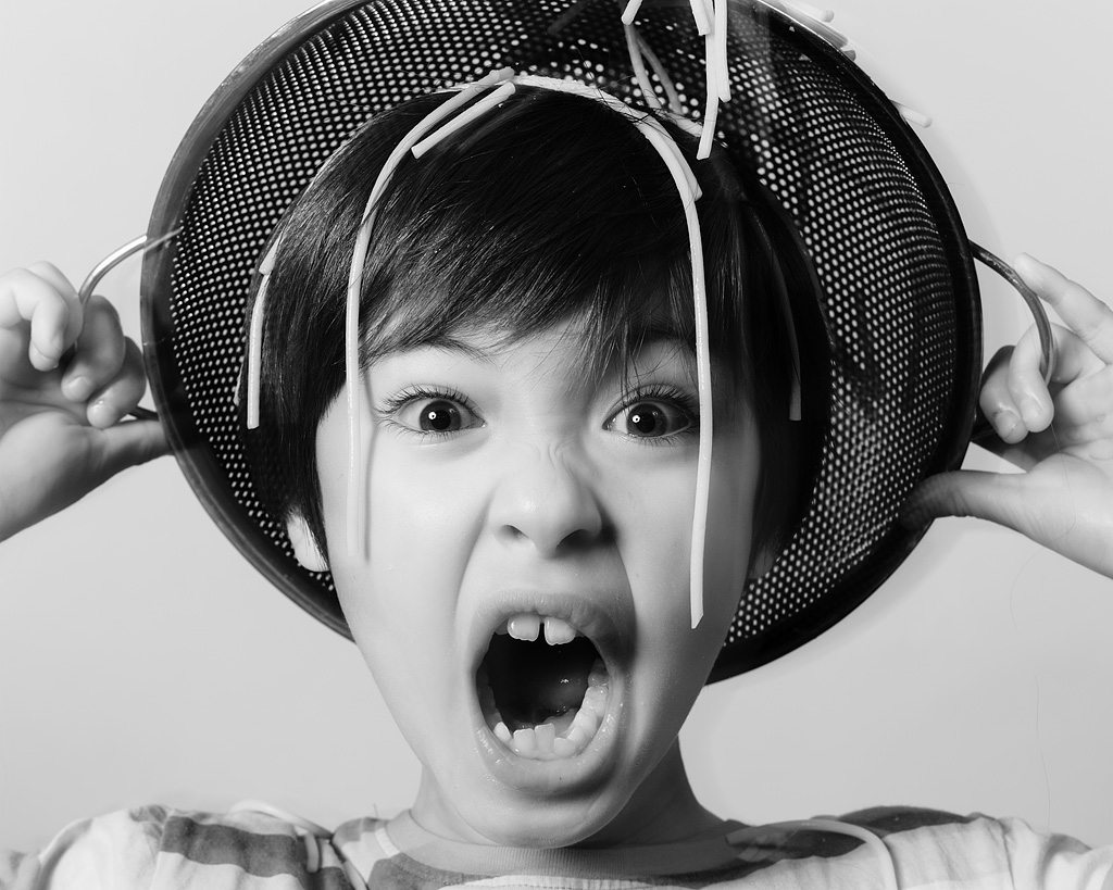 Tobie with Spaghetti and Colander on Head